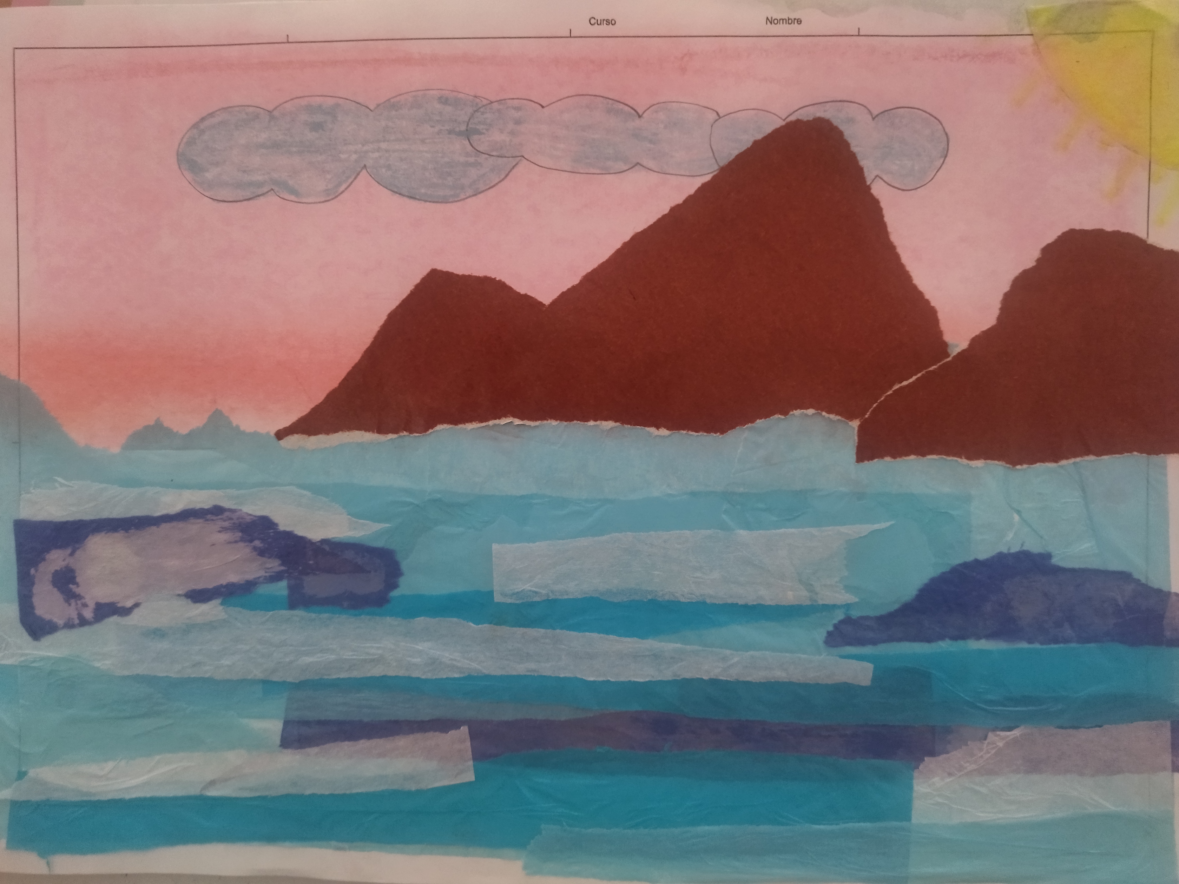 Creamos un collage con papel rasgado en la clase de 6° . Representamos un paisaje de costa empleando sobre todo papel de seda aunque también hemos utilizado otros tipos diferentes de papel .